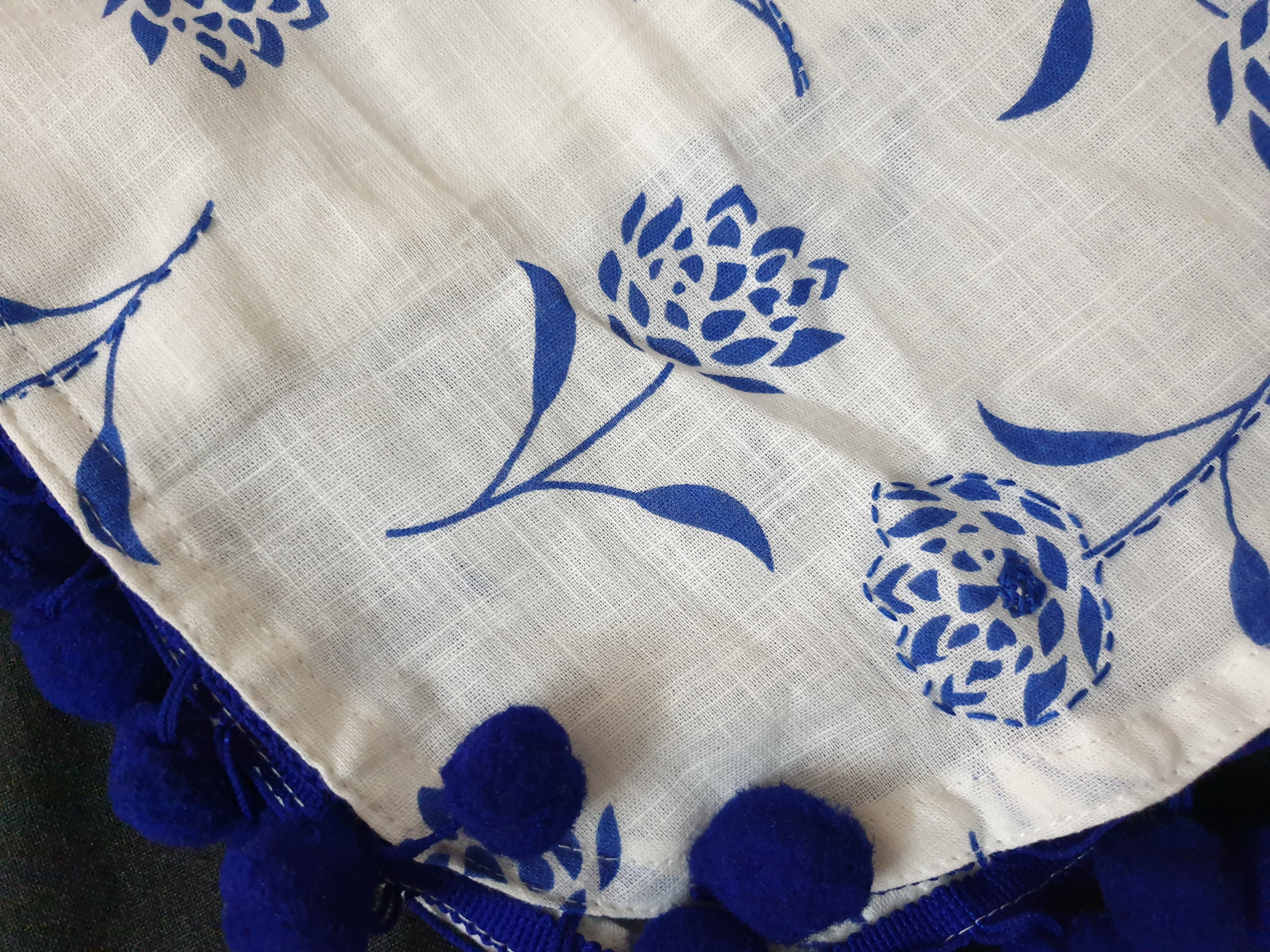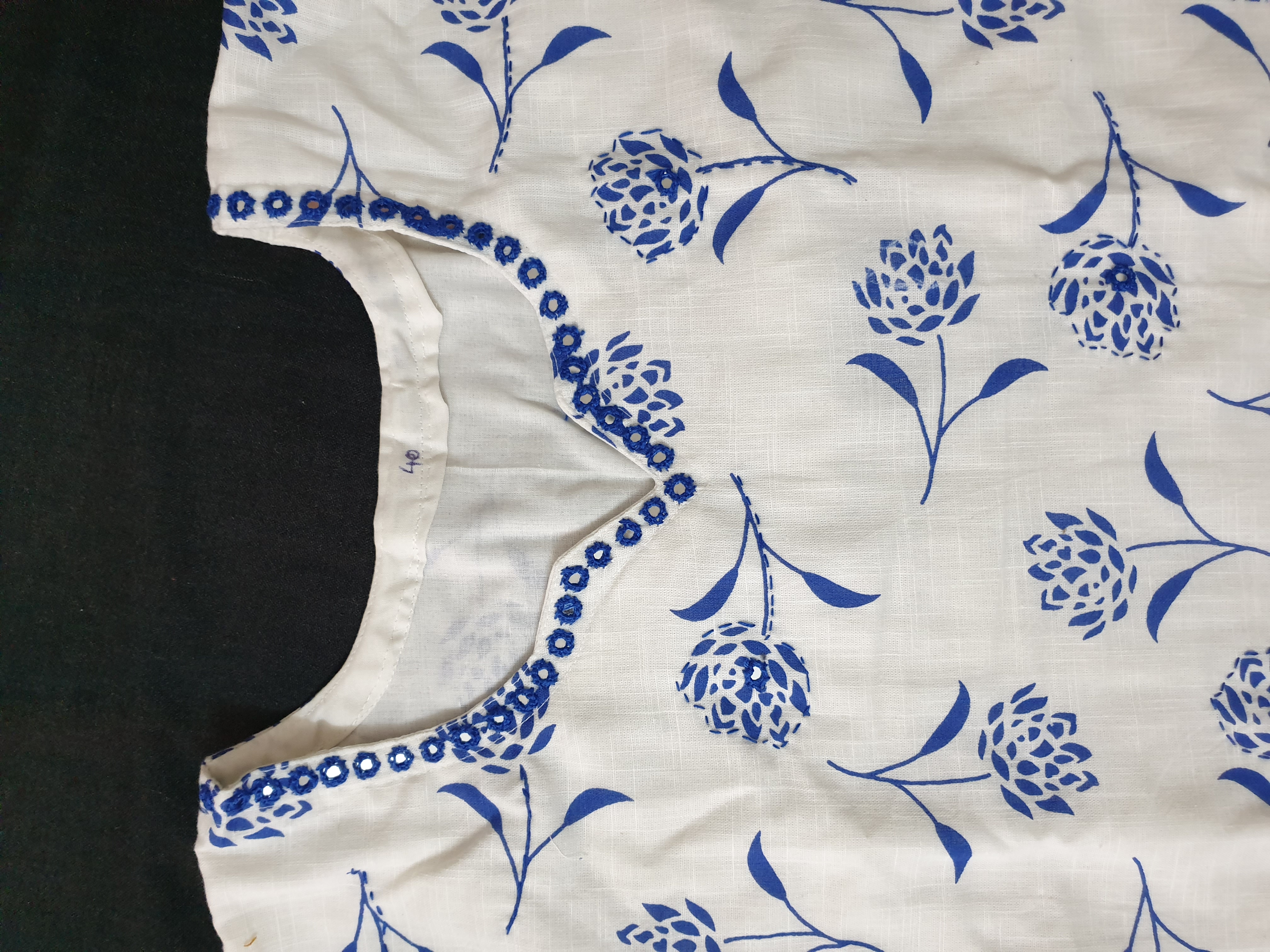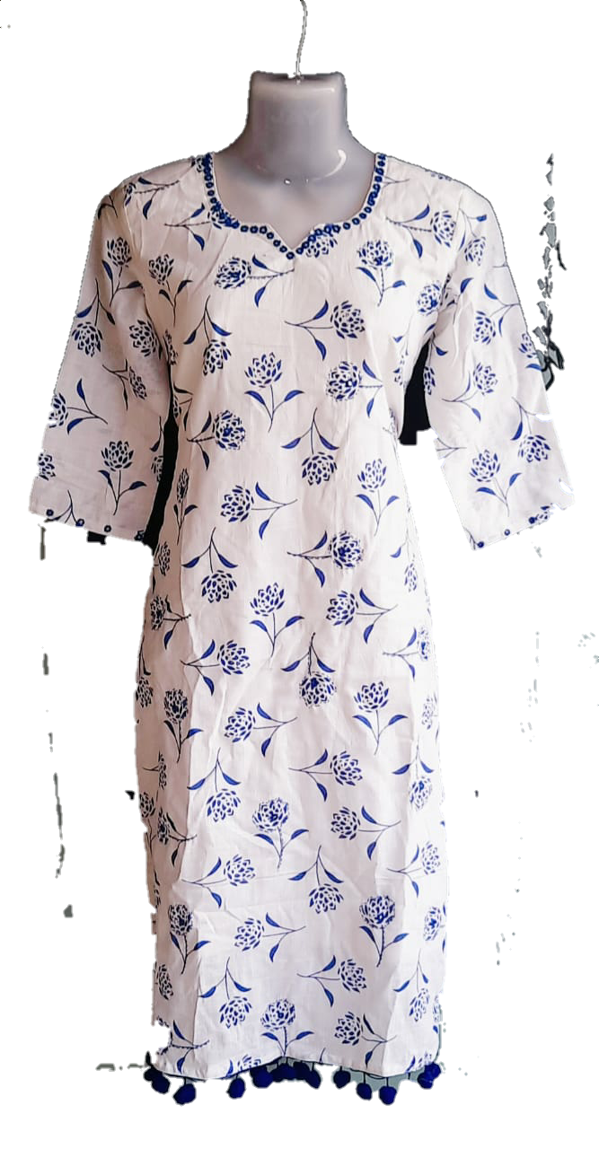 White and Blue Cotton Kurti with Front Mirror Work AndTussel..